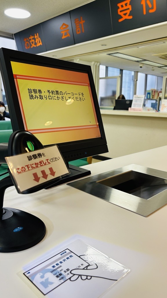 タッチパネルで受診したい科を選択します。予約のある方は予約診療科が表示されます。受付番号つきの当日予定表が出てきます。(お支払いまでお手元にお持ちください)